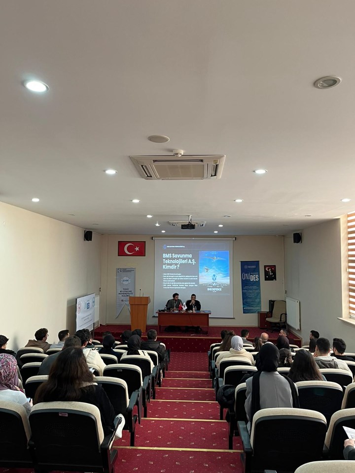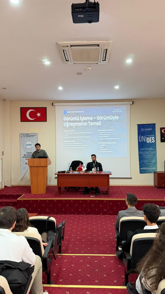 ÜNİDES 5. Dönem kapsamında, TOGÜ Bilgisayar Mühendisliği Kulübü tarafından düzenlenen; savunma sanayiinde bilgisayarlı görü, yapay zekâ ve gömülü sistemler temalı konferans düzenlendi. BMS Savunma Teknolojileri A.Ş.’den değerli konuşmacılar Barış Mert Kadıoğlu ve Ahmet Şentosun, gençlerimizle kıymetli bilgi ve tecrübelerini paylaştı.